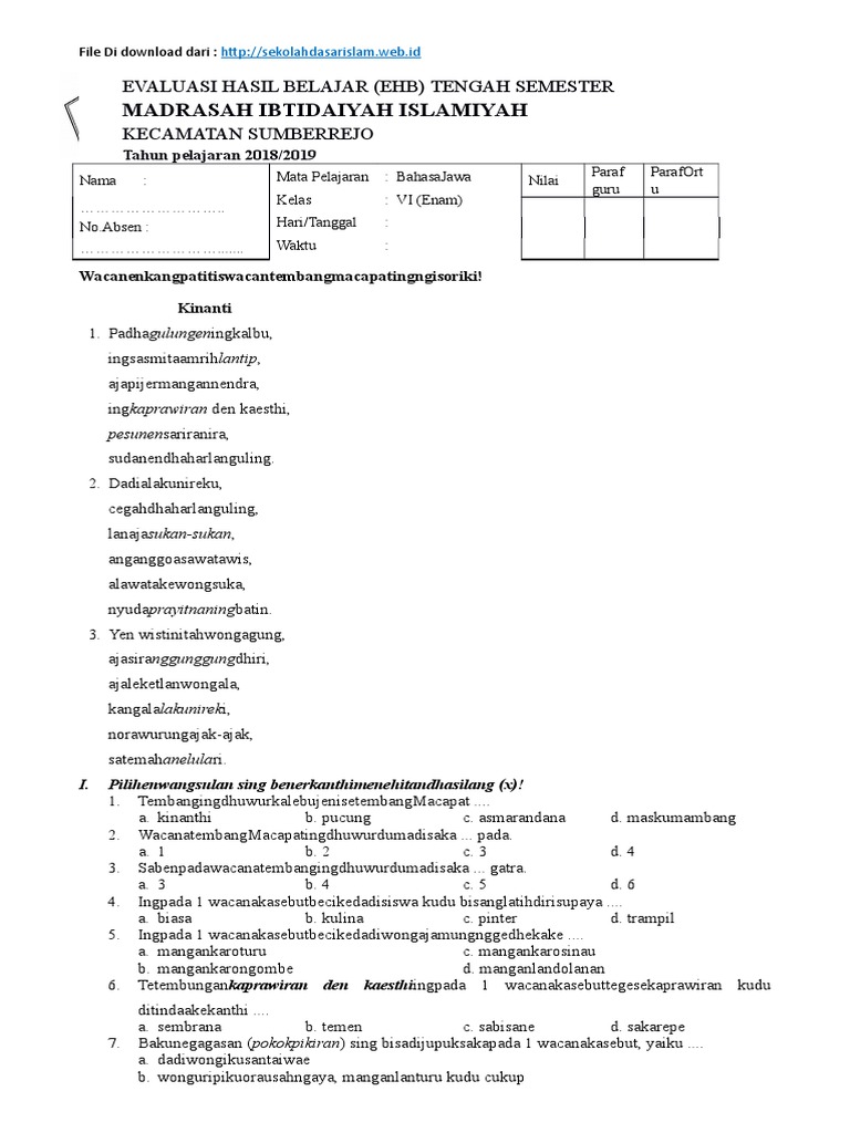 Peningkatan keterampilan membaca aksara jawa menggunakan. Jumlah keseluruhan soal pat bahasa jawa kelas 8 ini adalah 50 butir soal pilihan ganda. 4 contoh soal aksara jawa pilihan ganda soal plh kelas 9 semester 1 dan kunci jawaban contoh soal dan jawaban btq. Saya akan menjadi peserta kongres aksara jawa i, khususnya di komisi iii tentang digitalisasi. Contoh soal aksara jawa ruang belajar siswa. Pengembangan modul untuk mata pelajaran. Isikan identitas anda ke dalam lembar jawaban. Ini cara hitungan jawa soal berat atau ringan nama anda. Font jawa untuk menulis aksara jawa mi kalimulyo. Sdn dukuhturi 02 aksara jawa kelas iii. Soal uts penilaian tengah semester 1 bahasa jawa kelas 5. Sa, pa, ta, nya, na, ka, ga lan ba. Belajar aksara jawa 2 oleh philipus dellian agus raharjo.